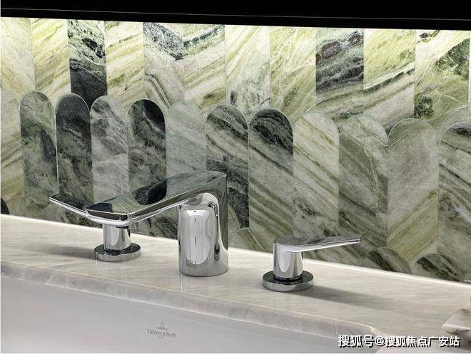 基础硬件都不差,项目在审美上还做了不少创新——卫生间大量采用奢石和石材,比如主卫柜体墙面就是香格里拉翡翠拼花,龙头是冷热分离式,成本更高: