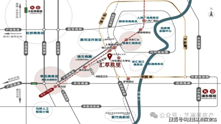 汇萃玖里 坐落闵行与徐汇区主城的交界的黄金中环地带,中环上中西路下匝口,虹梅南路与益梅路交汇处、东至虹梅南路(中环高架)、南至北潮港、北至益梅路。