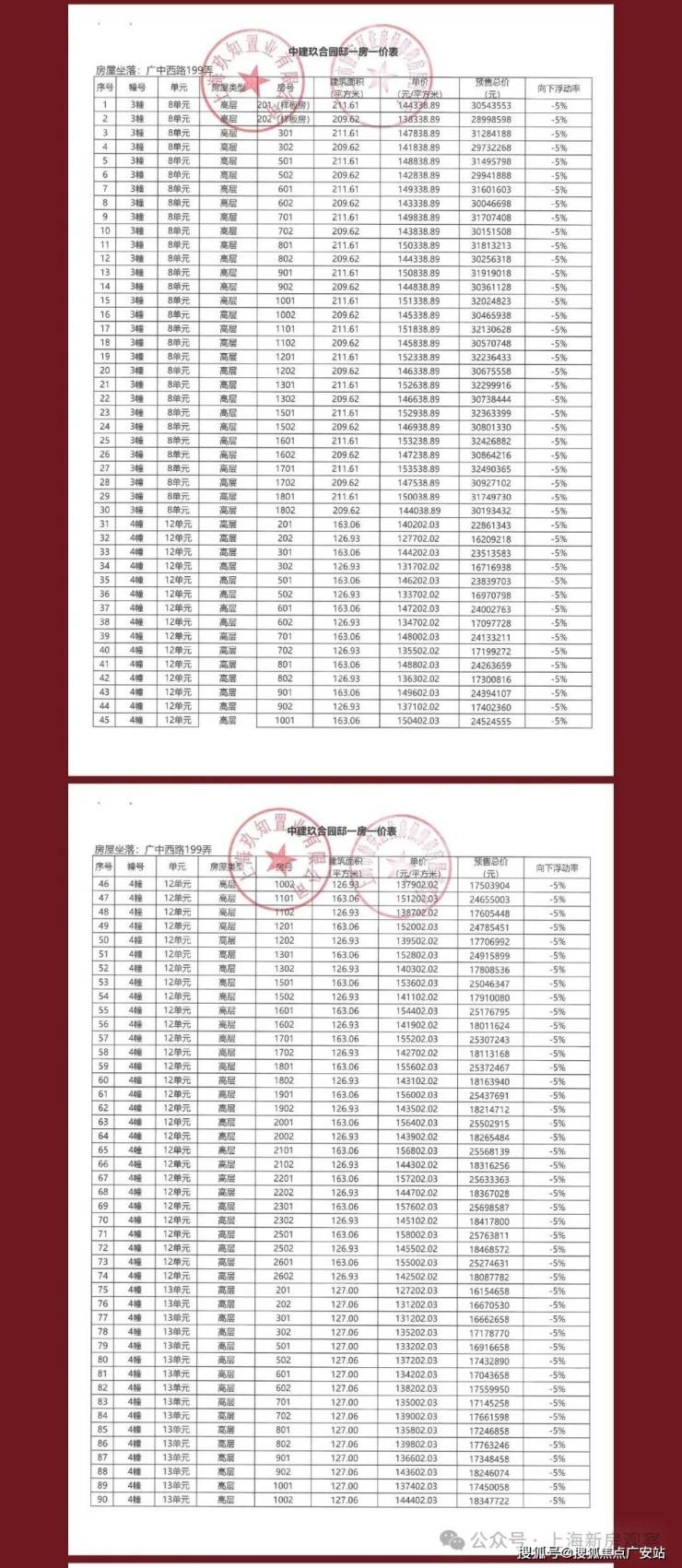 上期一房一价表如下
