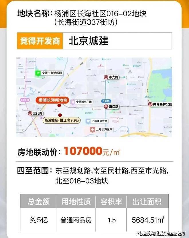 2022年7月25日,杨浦城投以20.8816亿元竞得杨浦区长海社区025-07地块(长海路街道332街坊),溢价率0%,成交楼板价50200元/㎡, 地块房地联动价99000元/㎡。