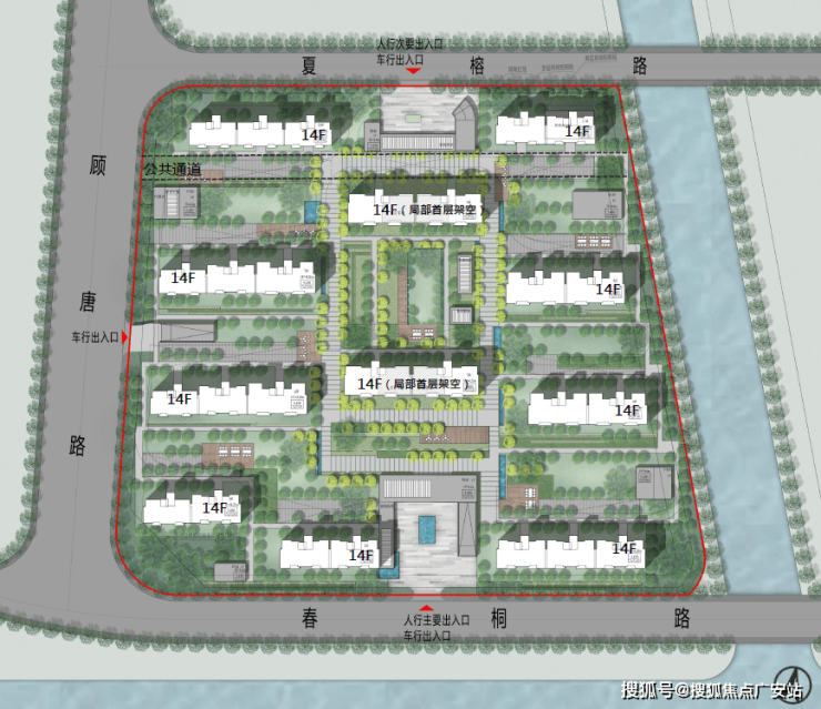 四至范围:东至中心河,西至顾唐路,南至春桐路,北至夏榕路。建有11幢总高14F的住宅,总房源721套。