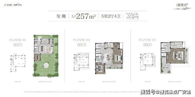 建面约257㎡户型为边套合院,五房两厅四卫的格局,每一层的空间都更为开阔,让业主享受到更加丰润的生活。