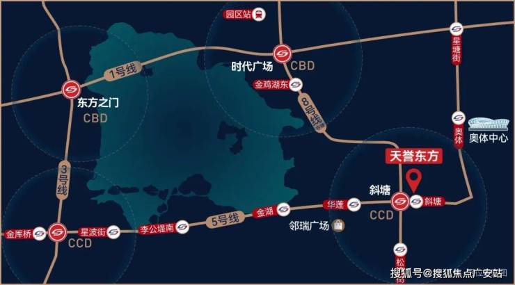 双轨交汇 黄金四角环湖四轨交汇,缔造金鸡湖黄金四角,西北-东方之门、东北-时代广场、西南-李公堤、东南斜塘老街一黄金四角所在核芯价值所向。