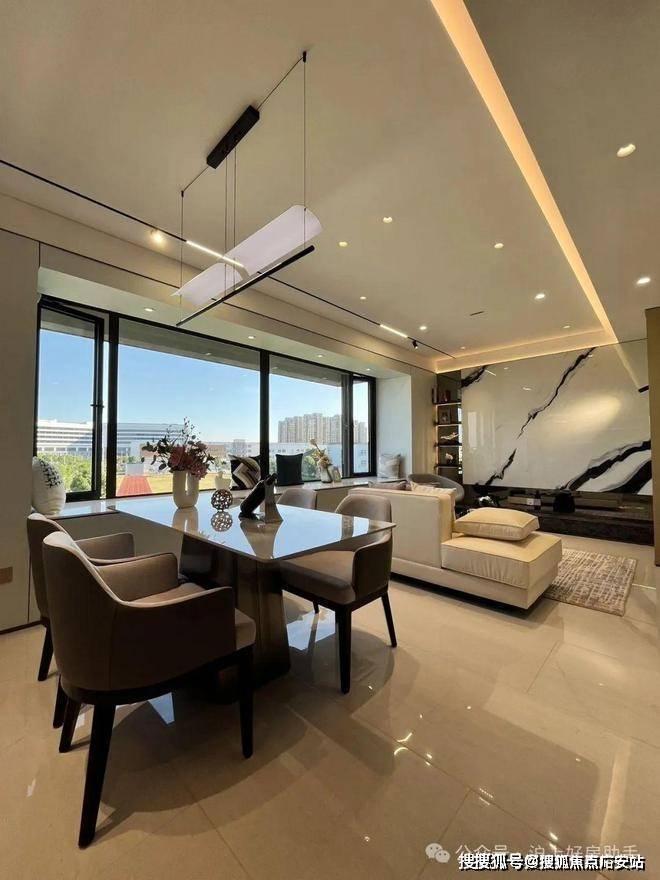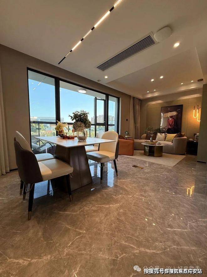 独立的入户玄关,出入皆有生活的仪式感,更方便做细致的收纳分区;客厅、餐厅相互独立,客厅南连宽景阳台,餐厅北连飘窗,让空间得以延展的同时,也让阳台的功能多样化;厨房就近连接餐厅,动线清晰,客餐厅通透明亮。