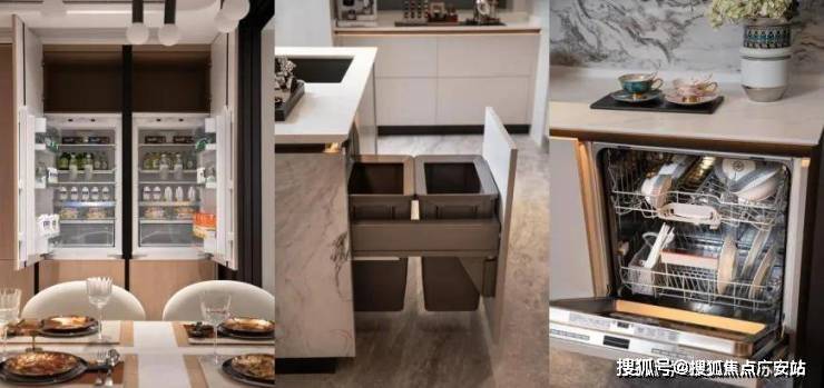 隐形上轨道夹丝玻璃移门,开合随心,也规避了卫生死角。公牛可移动滑轨插座,匹配多种烹饪习惯,杜绝空间的杂乱无章。石英石台面不仅高端大气,更具备耐磨、耐高温、抗污染和易清洁等特性。更贴心的配备了内嵌式垃圾桶,细节满满。
