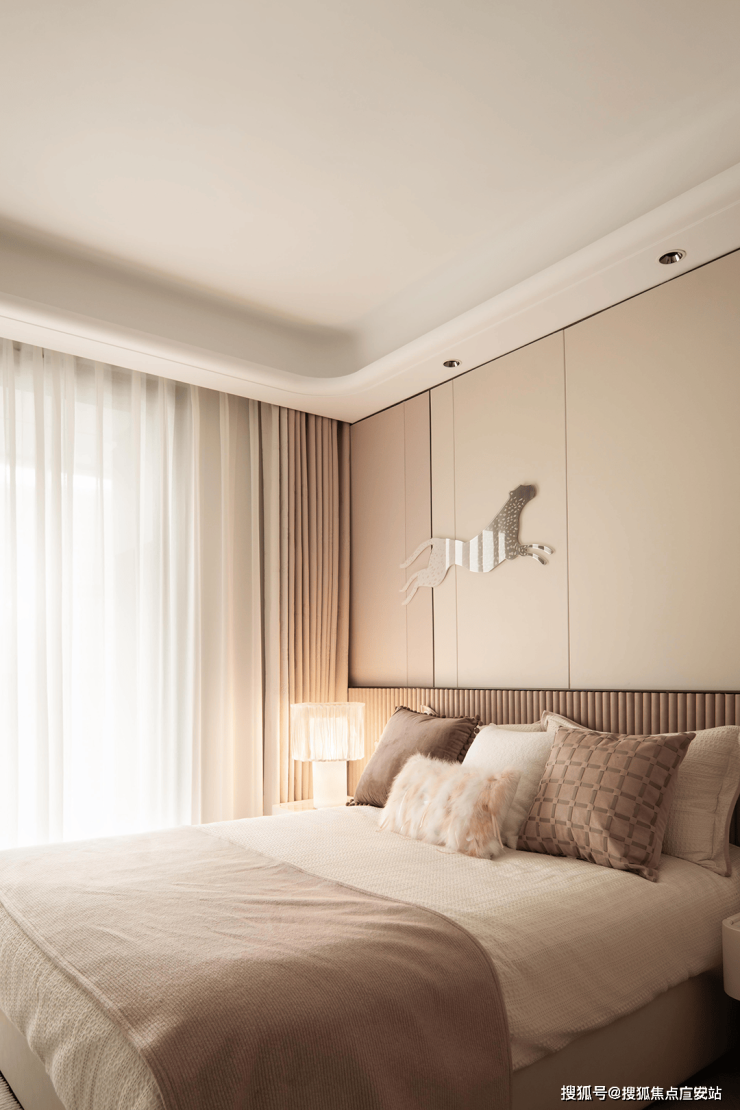主卧聚焦居住者心里层面的私密感受。将不必要的元素剔除,留下简柔色块,柔和的光线和质感细腻的材质,使整个卧室显得温馨而舒适。床前的绿植和窗边的阅读角,为居住者提供了一个放松心灵的角落。