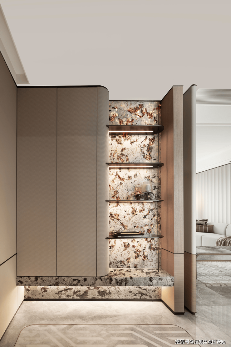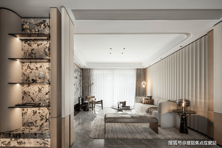 设计的主题元素来自于富春江水的气韵与形态,整体以素雅色调为主,儒雅,淡然。天然奢石“雪山飞狐”的运用,增添艺术氛围的同时,也使得视觉更具层次。