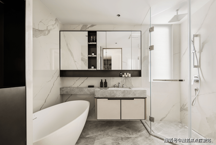 精致和实用并行,与衣帽间相对的主卫,在生活的动线内更为私密。大理石与玻璃相映,通透,舒缓。柔静的色调,身处其间,营造出纯粹宁静的心理感受。
