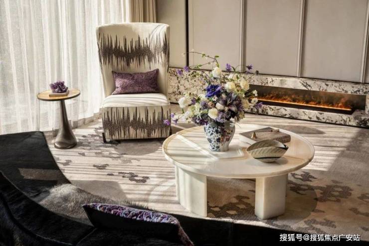 以极致简约的黑白为舞台背景,通过精炼的几何线条、先锋的艺术装置、考究的材质对比塑造强烈的现代艺术氛围。紫色作为唯一跳色,如同点睛之笔,贯穿空间,既象征艺术的不羁与神秘,又为冷静的空间注入活力与社交温度,激发居住者的交流欲望与艺术共鸣。