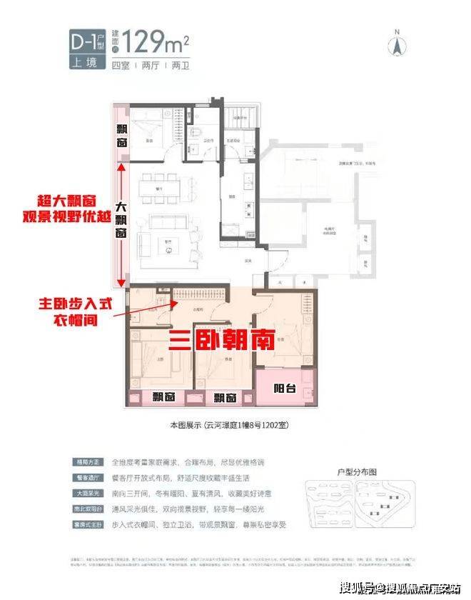 该户型相比传统三开间(只能南北观景)有一个很大优势:多一面采光面,能达到270°环幕采光和视野。