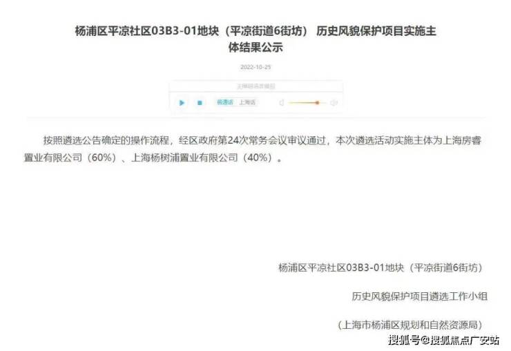 2022年10月25日,杨浦区人民政府官网发布公告,杨浦区平凉社区03B3-01地块(平凉街道6街坊)历史风貌保护项目实施主体结果公示:“本次遴选活动实施主体为上海房睿职业有限公司(60%)、上海杨树浦置业有限公司(40%)。”