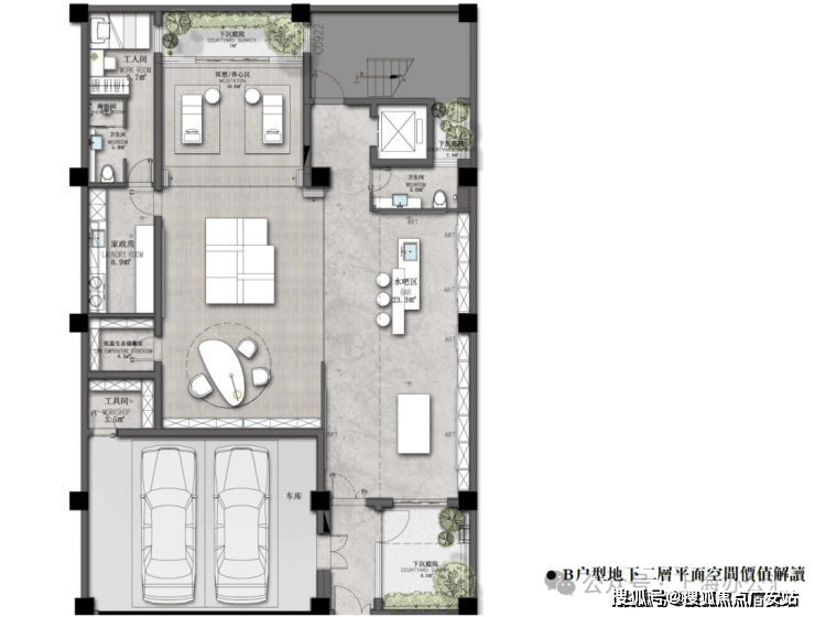 地下室6米挑高客厅 + 下沉式采光天井