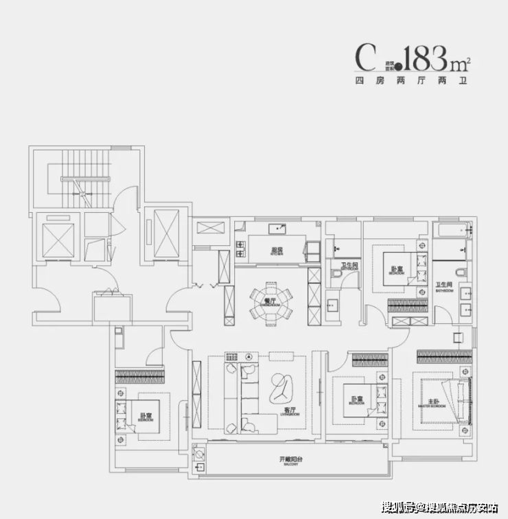 183㎡四房两厅三卫:南向四开间,双联阳台,南向大横厅。主卧带衣帽间和内卫,双台盆+浴缸,尺度感很足。南次卧带多功能间(可自行改造为卫生间),客卫干湿分离