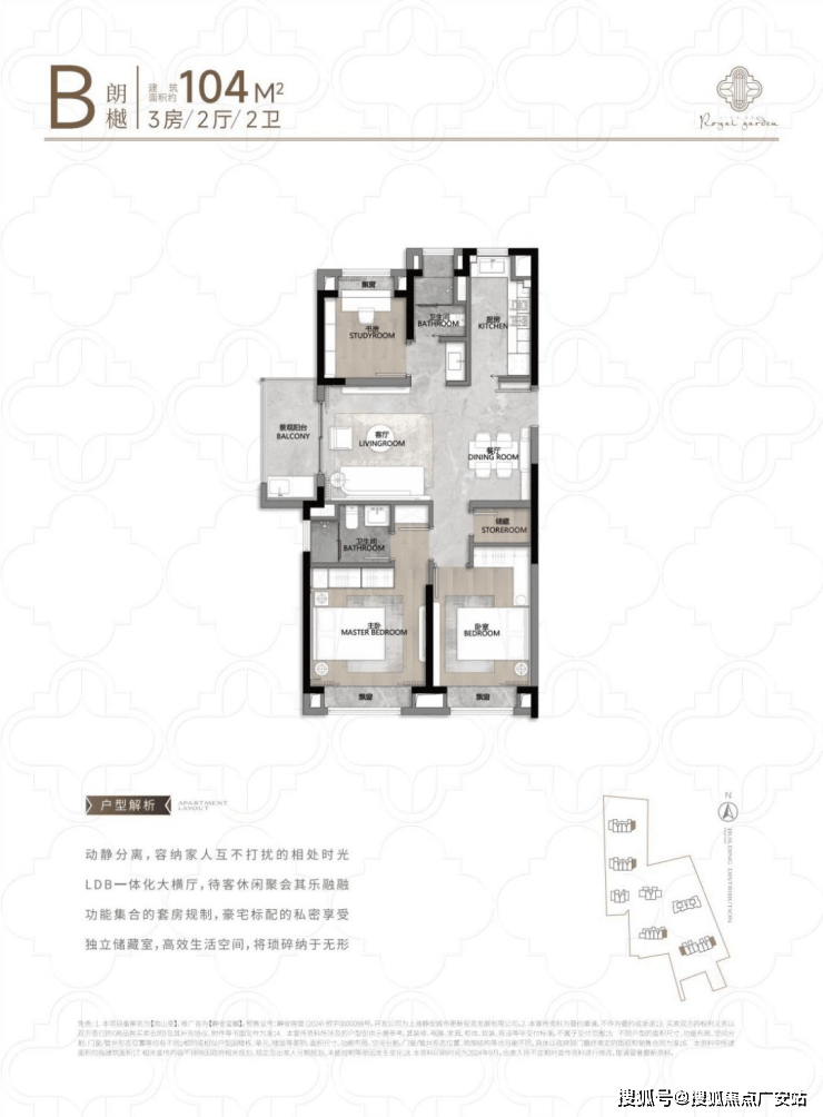 104㎡3户型特点:该户型多为楼栋的东边套,是一个观景户型。客厅连接270°阳台,视野出众。双卧朝南,阳光满溢。从次卫布局看,如果家庭人口较少,该户型还能做成双套卧。