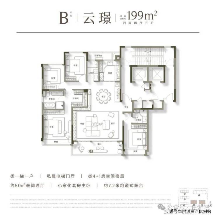 B户型主要分布在2幢和3幢,除了私属电梯门厅以外,B户型的格局上也更加突破,打造类4+1房的空间格局,主卧套房设计,预留独立衣帽间空间,整体约50㎡的奢阔通厅,可满足三代同堂居住需求,南向约7.2m跑道式阳台也让整个餐客厅空间更显阔绰。