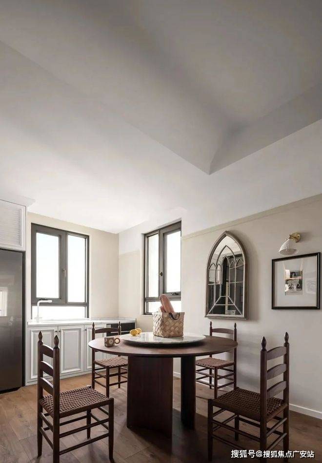 ▲ 复古铁艺镜子将光影摆弄,餐边柜里的面包砖增添质朴感,与木质结合自然从容,营造愉悦、肆意的用餐体验
