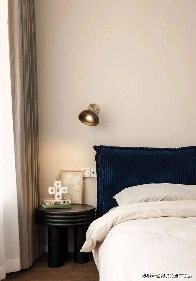 ▲ 老人房,以温暖的奶油色为底搭配原木地板,自然质朴,克莱因蓝绒面大床和暖光壁灯,温馨有格调