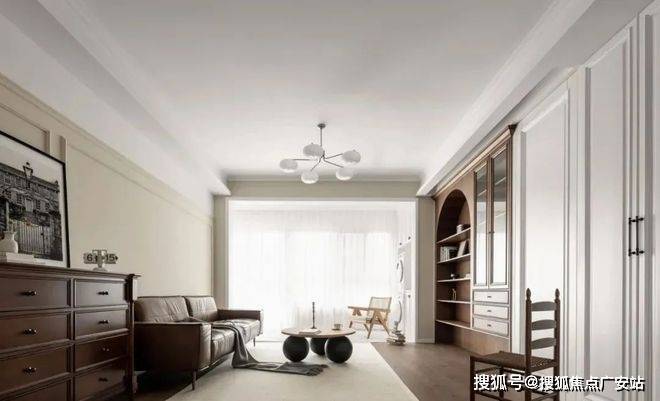 ▲ 客厅纳入阳台,拓展空间增加采光,木地板通铺,顶面线条简洁,搭配美式家具,感知时光温润