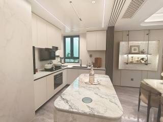 精装标准:采用博世(或同档)厨电、唯宝台盆、高仪智能马桶;玄关石材拼花,电视背景墙奢石+皮革造型;全屋壁纸/木饰面,入户智能锁。