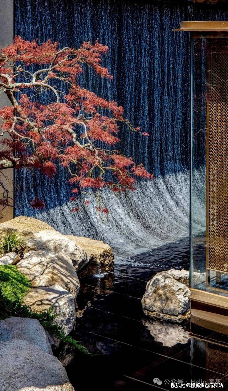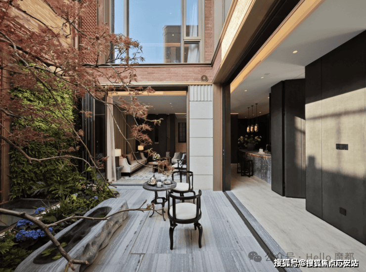 山水庭院汲取《足立美术馆》的造境手法,以老石皮、百年古木原样搬运,重现山间岁月的自然痕迹,与庭院中的光影交织,仿佛将山间的自然采光与静谧之感搬入城市。阳光透过树梢洒落,石皮上的纹理在光影中若隐若现,宛如一幅流动的自然山水画卷。
