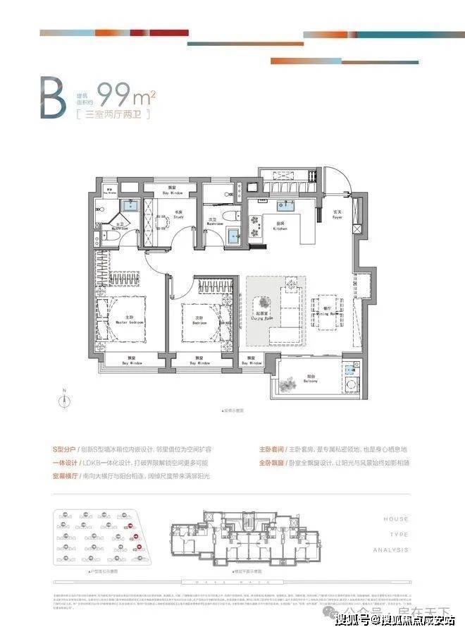 建面约99㎡B户型客餐厅配置超大尺度横厅,全卧室飘窗就连主卫也配置了一个飘窗;