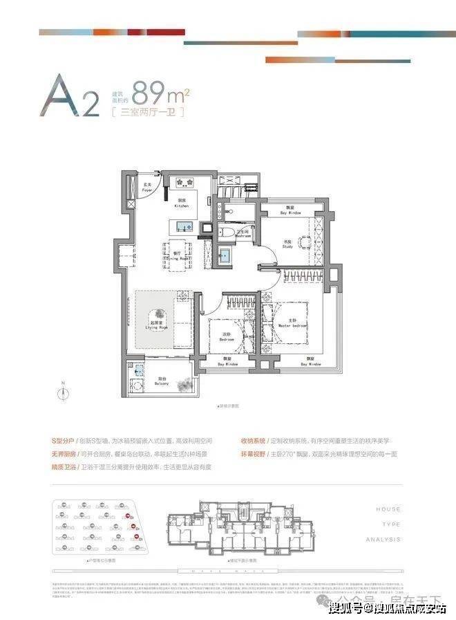 建面约89㎡3房东边套主卧配置约270°双向采光飘窗、S墙设计;