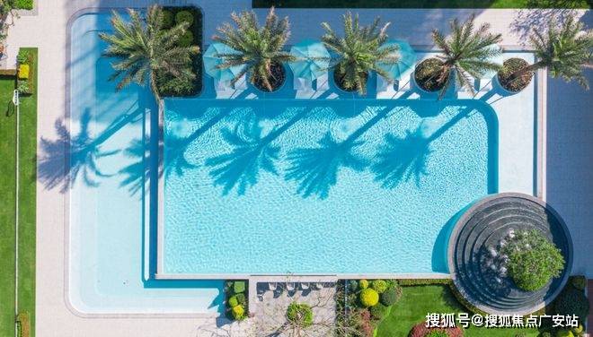 大量的玻璃幕墙+局部铝板等建筑元素的恰当组合,低密的纯洋房大盘在园区中央打造了颠覆性的“六翠之境”:目之所及是一片通透的蒂芙尼蓝,镜面泳池里波光粼粼,倒映着蓝天白云,是真正的“天空之镜”,与边上高大的棕榈树、白色的躺椅、繁茂的绿茵,彼此映衬,海边度假风油然而生。