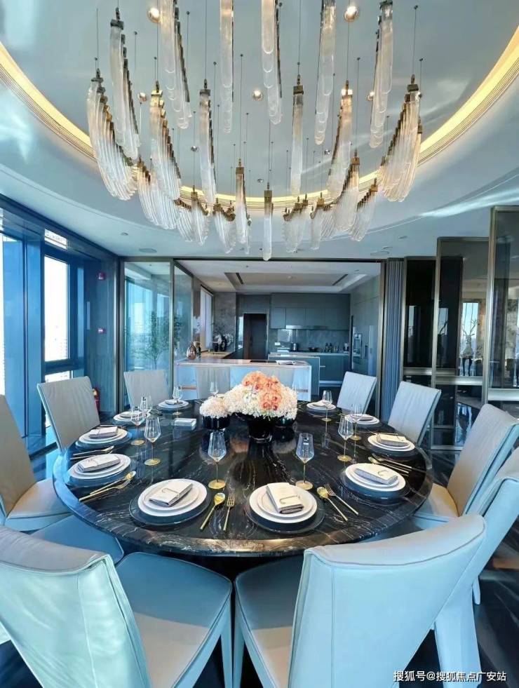 The 579㎡ unit features a 35-meter south-facing width, 3.6-meter ceiling height, and a 270° panoramic glass curtain wall, offering an IMAX-level view of the city skyline and garden landscape. 全套房设计搭配动静分离布局,主卧套房面积超120㎡,配备步入式衣帽间与双卫浴系统,满足塔尖人群对品质生活的极致追求217。