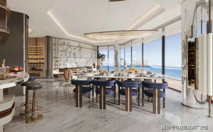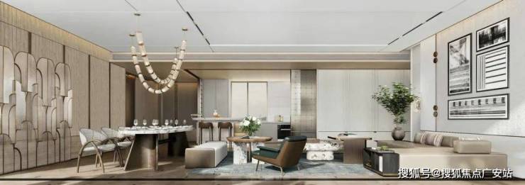 开放式的客餐厅设计,吊顶侧边一些细节的处理与柜子的钢条和大理石的分缝有一些联系,整体立面的横向缝隙的高度都有一些相应的联系,让空间的感受更为整体并且相互之间有一些联系。