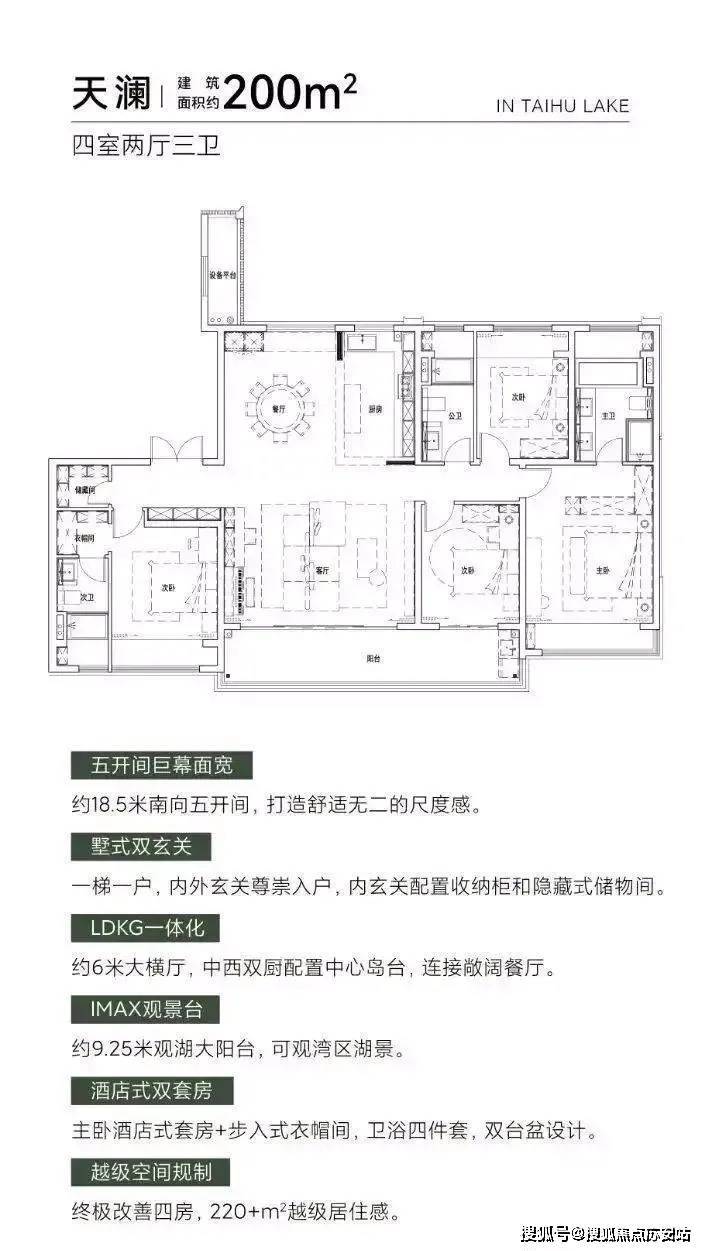 约14.3米南向四开间,全屏式采光面让光线参与空间的设计,阳光与清风于此成为生活的主角;约7.8米双联跑道式阳台,270°宽屏瞰湖视野,湖湾浩瀚与园林森境尽揽于眼前,建筑与自然的边界消弭于无形;创新的LDKG一体化设计,让餐客厅与厨房阳台无界相连,窗外万千风景徜徉流动于室内;酒店式星级主卧套房,私享全景飘窗、步入式衣帽间、独立卫浴,科学的功能区划分、人性化的精装细节,让精致的起居感受流淌于每个空间细节。