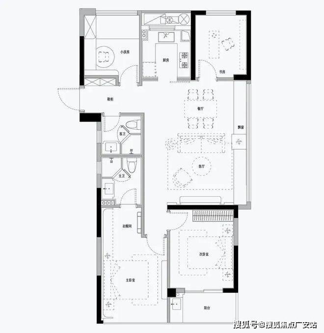 (建面约)111㎡边套做了四房,面宽约6.1米的一体化餐客厅,面积近30㎡!南向双卧,同样有着面宽约6.4米的南向双联阳台。