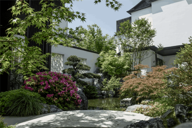 当你独坐露台或室内,玻璃幕墙、栏杆,丝毫不会影响你的景观视野;独门独户的院子里,有煮茶空间、花道空间等,饮茶、插花、下棋或会客,可满足文人雅士般的归隐生活;当你徜徉在巷道里,两道深墙之间,一条树木掩映下的林荫夹道上,偶遇一块精致的石头、一棵精致的树,转头又能看见一扇樱花点缀的花窗画景......