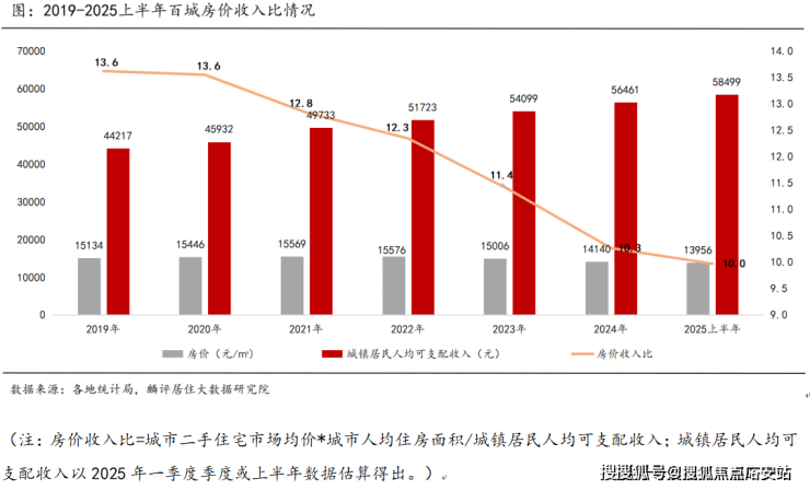 麟评居住大数据研究院发布的报告显示,其监测的100个重点城市2025上半年房价收入比为10.0,相比2024年下滑2.9%,跌幅收窄6.8个百分点,自2019年监测以来,房价收入比均呈现年年下滑的局面,较2019年下降近3成。