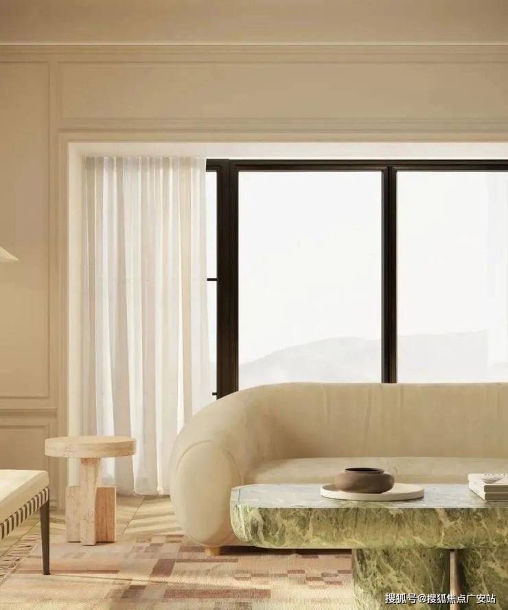 空间中每个物件都经过精心挑选:鱼骨拼木地板沉淀时光质感,格纹地毯与抹茶色大理石茶几搭配,营造出优雅而不失温度的氛围。