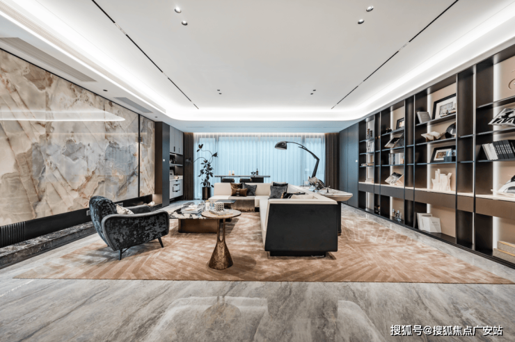 1、客厅采用会客厅+开放式书房布局,增强家庭互动,重塑社交中心,优化空间尺度,破解“空旷感;