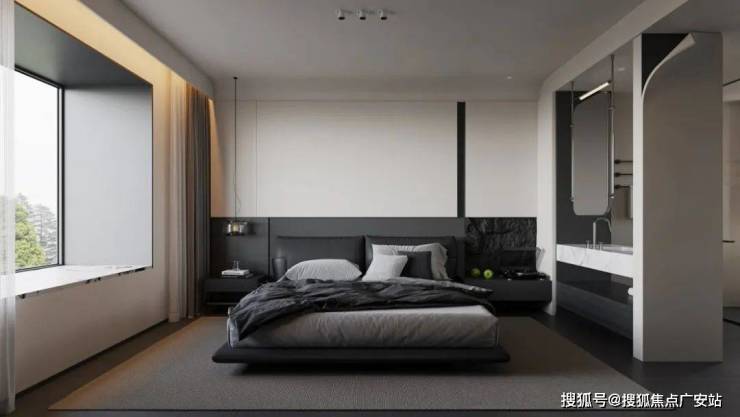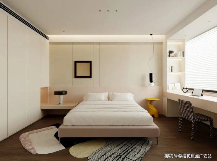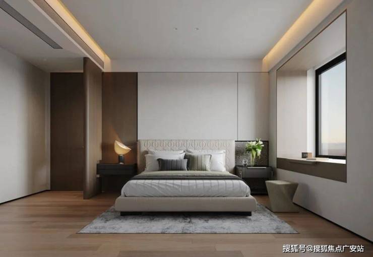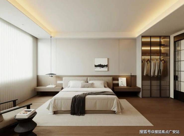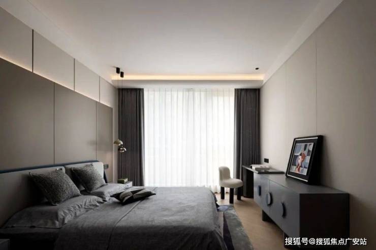 3、主卧一字型床尾柜+刷状台,整合收纳与通道,充分利用主卧进深,同时增强主卧空间的通透感。