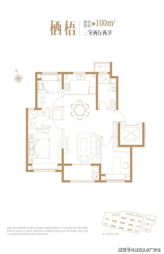 建面约100㎡户型3室2厅2卫▼