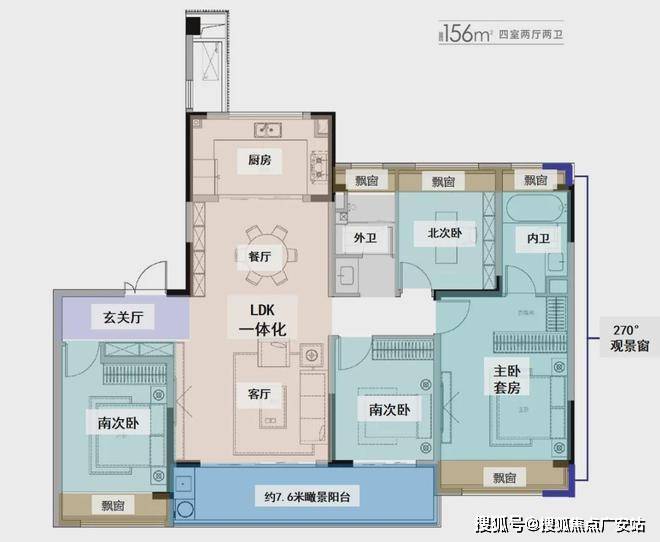 户型:主推152-156㎡四居(全四开间朝南,主卧套房+独立衣帽间,全屋赠5飘窗)