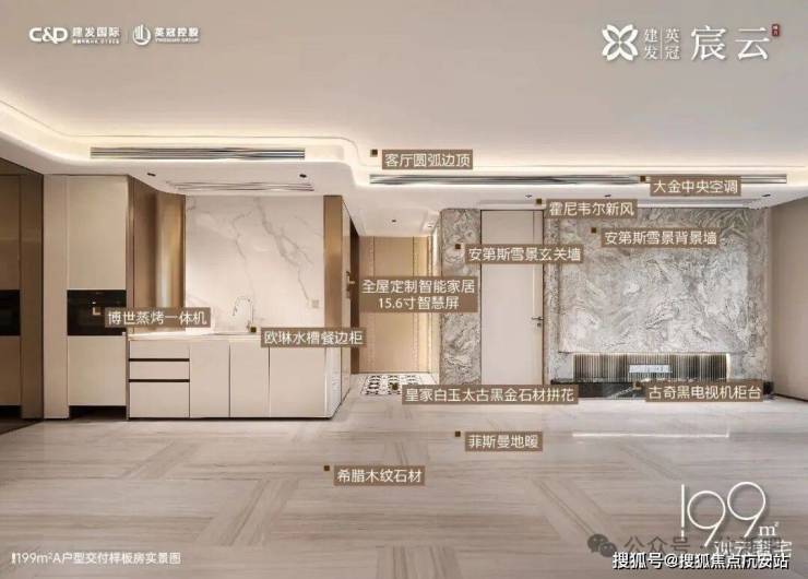 在室内精装上,宸云也采用超高的精装标准:大金中央空调、霍尼韦尔新风、博世洗碗机、博世蒸烤一体机、方太油烟机、方太燃气灶等,餐等运用大面积石材,堪称“奢石博物馆”,全屋还定制了让生活更有秩序和整洁的收纳体系,高层户户赠送储藏柜。