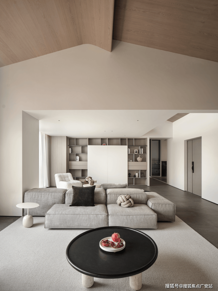 坡形顶的设计不仅提高了空间的视觉高度,也增加了空间的层次感和个性化艺术美感。通过巧妙隐藏空调风口等设备,整体空间变得简约干净。