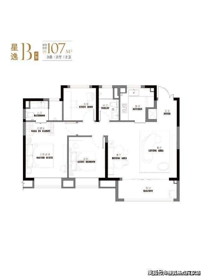 项目约103-107㎡3房2卫设计,有着宽绰的大横厅设计,并且3.5开间朝南。
