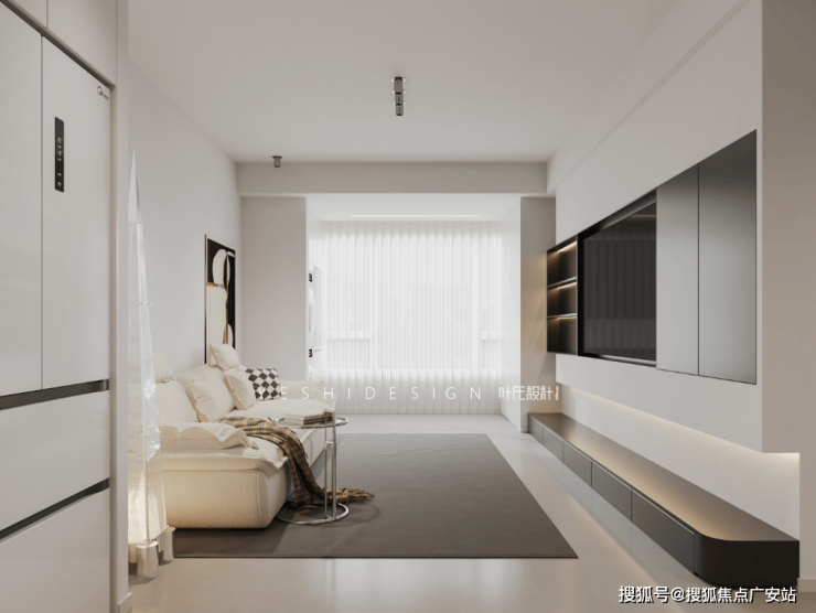 开放通透的主卧空间里,洁净与低饱和度的色彩延展开慵懒的优雅,洁白的墙上一幅黑白艺术画似凝固的哲思,以极简线条晕染空间的深邃意境。