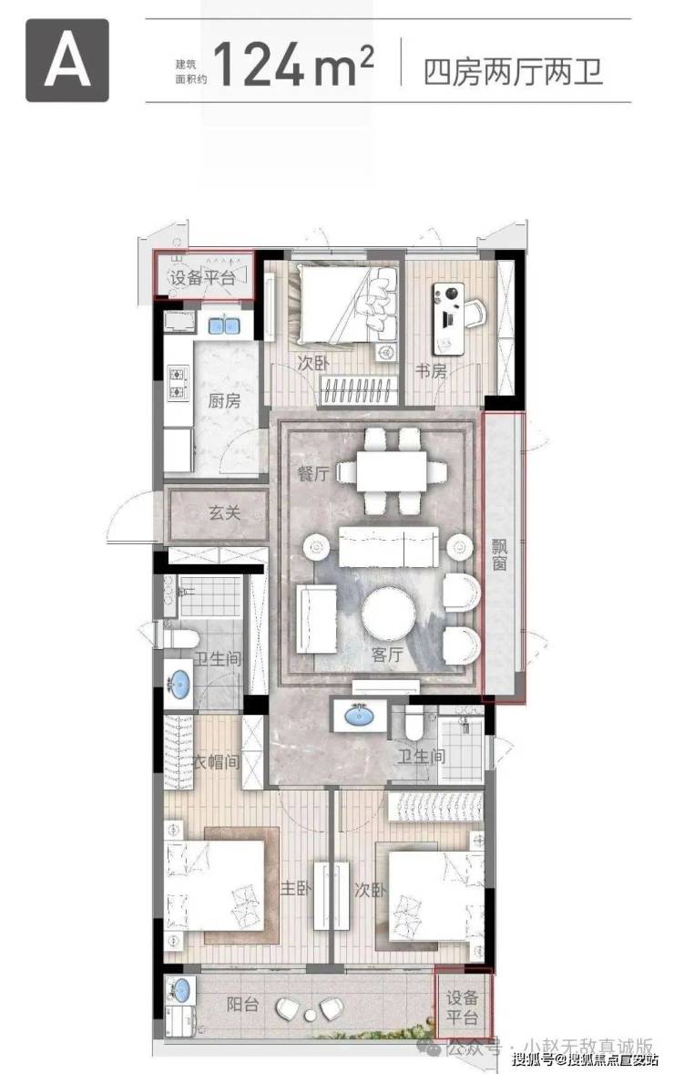 建面约124㎡四房两厅两卫: