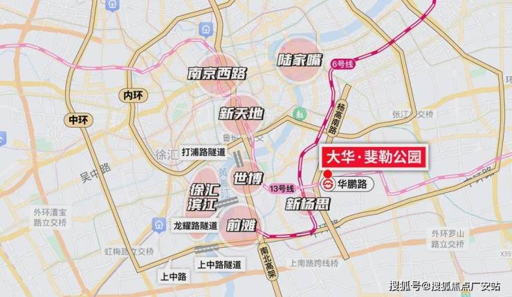 项目处于内环、中环之间,周边地铁 13、6、7、8号线四轨环绕,尤其是13号线华鹏路站3号口距项目直线距离仅约50m,真正的家门口地铁;