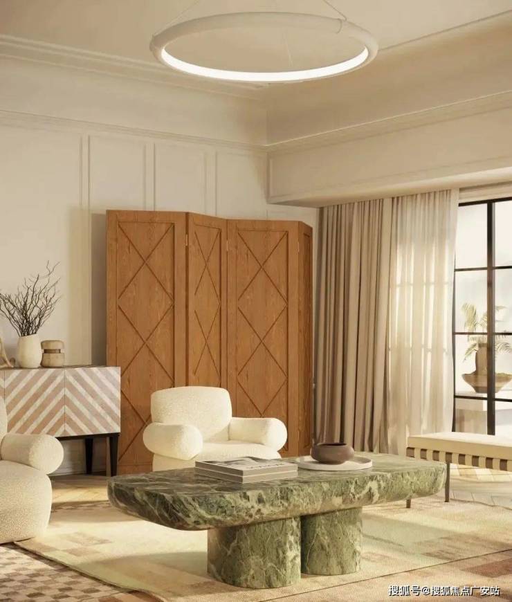 空间中每个物件都经过精心挑选:鱼骨拼木地板沉淀时光质感,格纹地毯与抹茶色大理石茶几搭配,营造出优雅而不失温度的氛围。