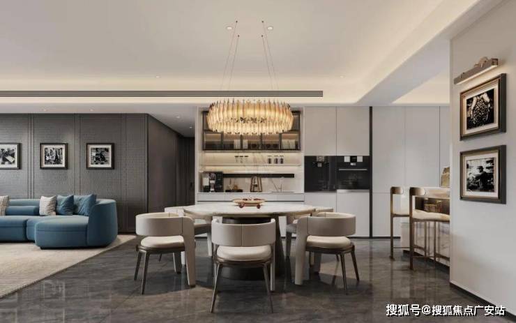 【中央会客厅】LDKB一体化设计,厨房、餐厅、客厅、阳台彼此联通,客厅通铺至阳台,实现空间场景的多重变化,深化家人间的互动交流。