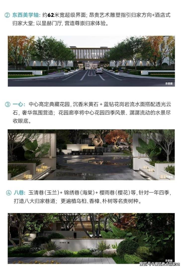 社区设计:社区设有 52 米沉香米黄石大门与星空穹顶,打造了 62 米中轴景观步道和高定典藏花园,同时规划了玉兰、海棠、樱花等八大主题巷道,景观层次丰富。