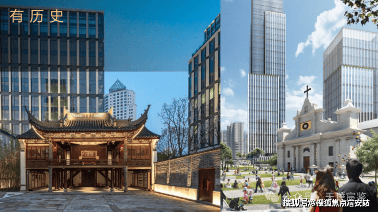 项目坐拥董家渡天主堂和商船会馆 2 栋历史保护建筑、6 个口袋公园(花桥空中花园 / 教堂花园 / 会馆花园 / 百草园 / 健康花园 / 中央花园)、滨江文化休闲空间等文化功能配套