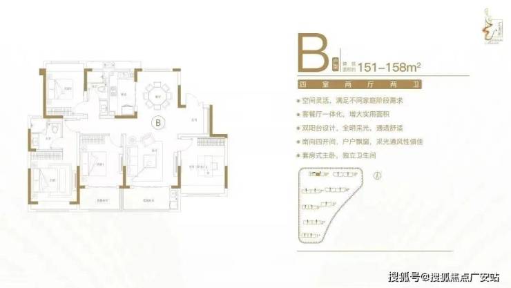 建面约151-158㎡四室两厅两卫户型特点:空间灵活,满足不同家庭阶段需求;客餐厅一体化,增大实用面积;双阳台设计,全明采光,通透舒适;南向四开间,户户飘窗,采光通风性俱佳;套房式主卧,独立卫生间。