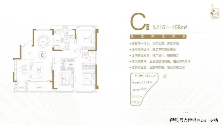建面约151-158㎡四室两厅两卫户型特点:客餐厅一体化,空间实用,尺度开阔;多功能间设计,满足不同居住需求;全明采光布局,横厅设计,明厨明卫;南向四开间,主生活区域朝南,阳光清风常伴;套房式主卧,主卧带飘窗,独立衣帽卫。